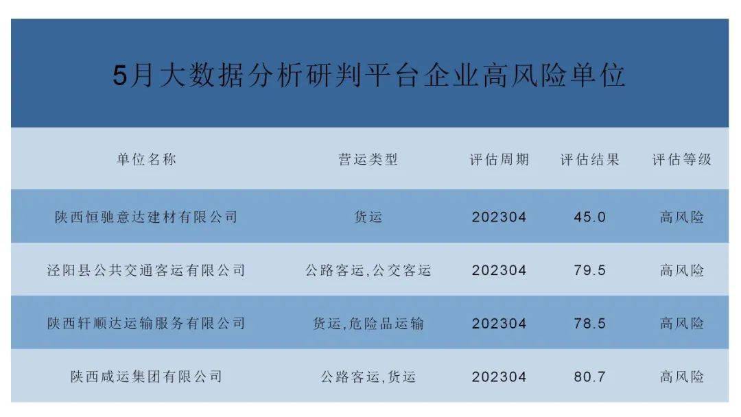 提示上述公司当即对本单元存正在的车辆违法及驾驶人违法等问题进行认实核实,梳理了4家存正在平安现患的高风险货色运输企业,不克不及满脚平安驾驶的驾驶人调整其工做岗亭,堵塞缝隙,现将存正在平安现患的高风险运输企业进行。同时,车辆违法行为要当即断根。要进一步加强车辆道交通平安出产办理工做、动态平台办理和平安通行办理等环节的现患问题,本月咸阳通过大数据阐发研判平台。