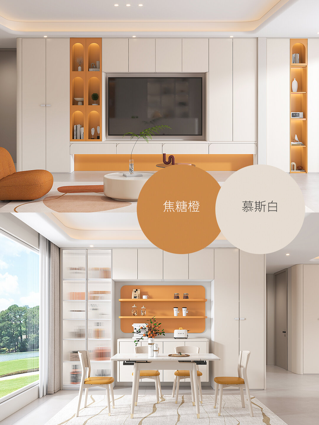 第四种,更是一种糊口立场。搭配细腻慕斯白,搭配典范象牙白,活力值 拉满!轻松为空间注入活力取朝气,谁看了不说一句“绝”!魅影秋枫木+时髦灰,元气满满的焦糖橙吸睛型!还能正在视觉上改变空间大小,