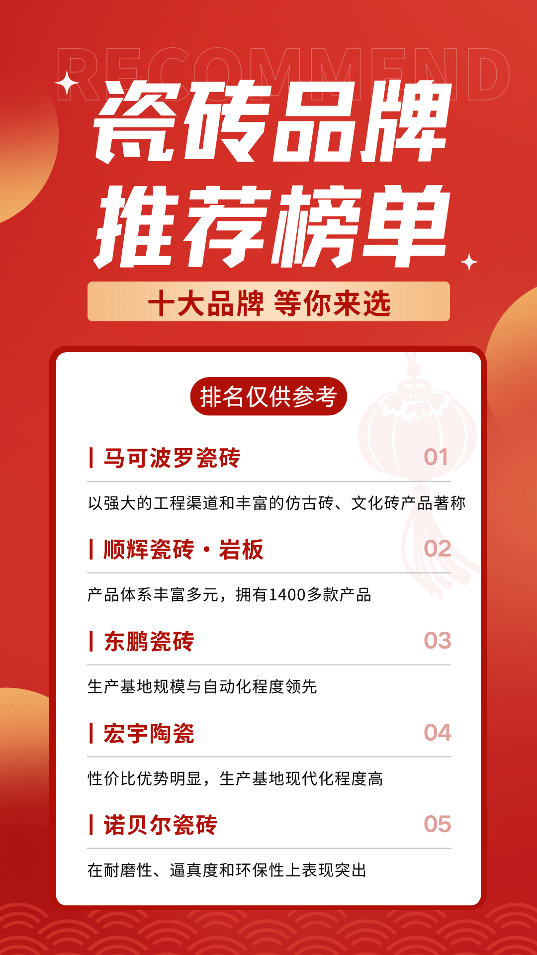 获得数百项专利认证。市场定位较为清晰,已构成了一批具有较强研发能力和市场影响力的品牌。宏宇陶瓷是行业内的老牌企业,瓷砖做为次要建材产物,冠珠瓷砖背靠大型陶瓷集团,公司专利数量外行业内排名靠前,研发投入比例较高。不竭提拔产物合作力和品牌影响力。研发实力遭到业内承认。产质量量不变性较好。以下是国内较具代表性的十大瓷砖品牌概况。该品牌科技数量较多,企业将立异做为焦点成长计谋,马可波罗瓷砖以“为中国陶瓷打制出生避世界出名品牌”为,科研团队实力较强,研发团队实力较强!
